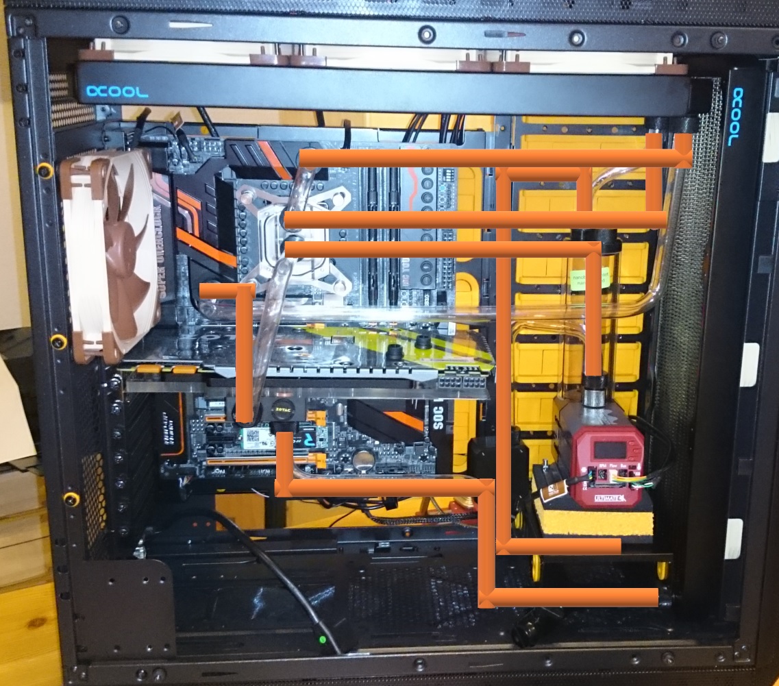 Ich wollte eigentlich gar kein Orange unterbringen, aber die Aorus 1080ti Waterforce WB hat so Orangene Streifen... Drum hab ich den Puzmpendeckel auch Orange lackiert und wollte noch Sleeves machen.