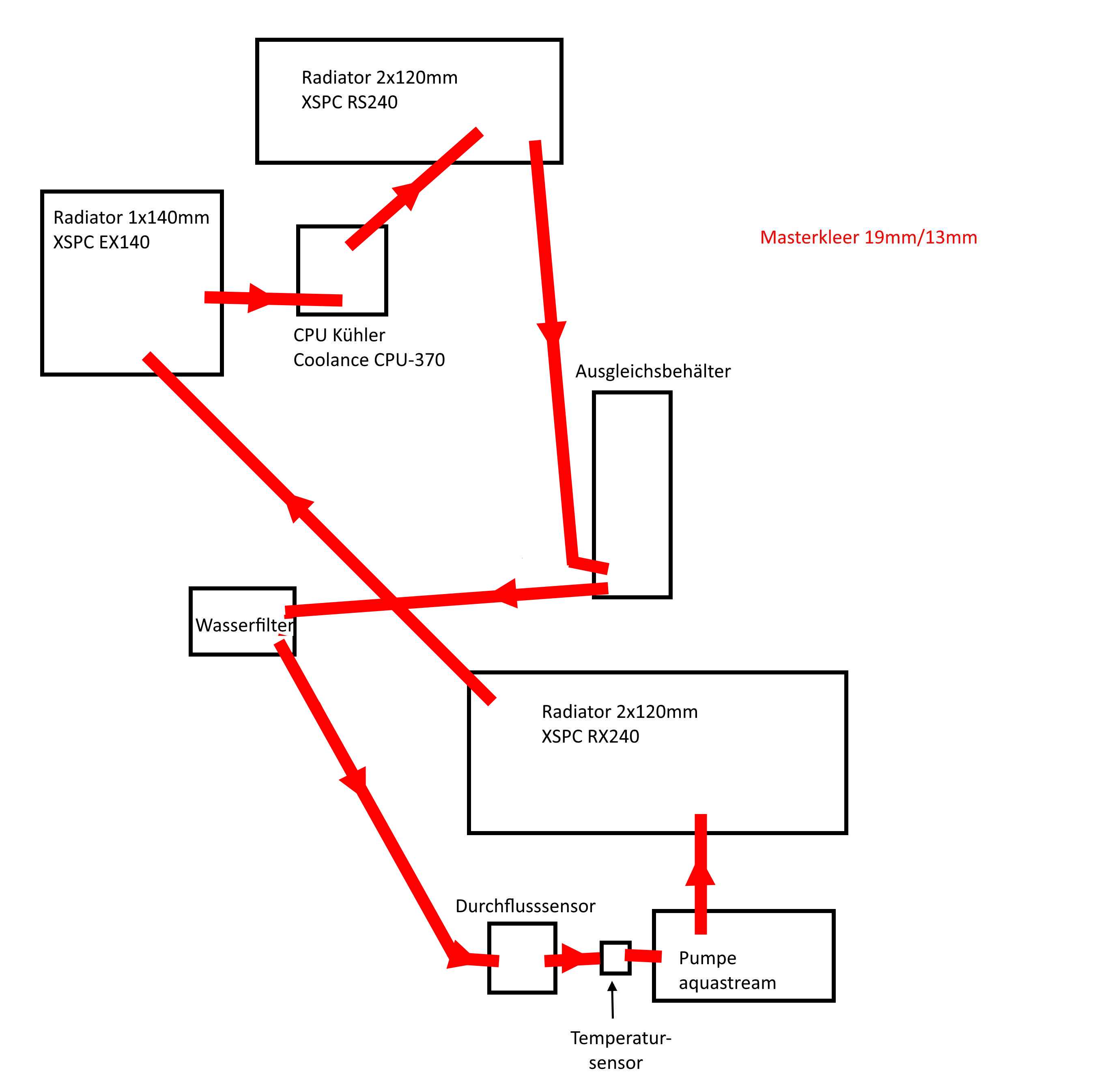 Ich werde die Wasserkühlung die Tage auseinander nehmen und nach der Ursache forschen. Mir geht es hier vor allem darum andere Meinungen zu hören. Vielleicht sagt ja jemand auf Anhieb, dass das nicht funktionieren kann weil Ein- und Auslasse ungünstig gewählt wurden oder es aus anderen Gründen nicht geht.