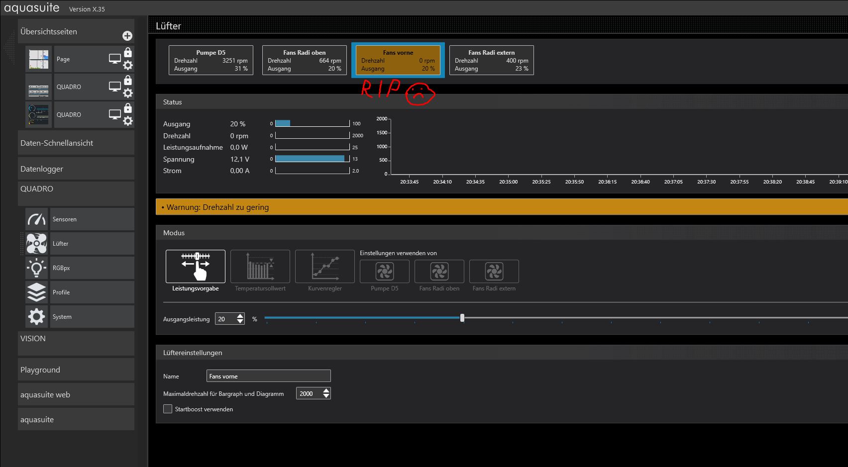 Im Endeffekt geht jetzt ein Kanal der Quadro nicht mehr zu steuern. Wenn ich da jetzt Lüfter anschließe, dann drehen die nur mit fullspeed und lassen sich nicht mehr steuern. Hab das auch mit verschiedenen Lüftern getestet.
