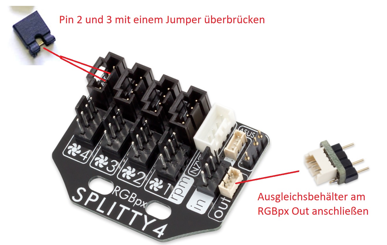 Nun möchte ich meine Ausgleichbehälter Beleuchtung (Alphacool Aurora) noch anschließen. Diese hat ja ein ARGB Adapter Anschluss. Ich könnte nun ja ein Adapter RGBpx Adapter für Komponenten mit Mainboardanschluss https://shop.aquacomputer.de/product_inf…roducts_id=3829 nutzen, aber ich bekomme ihn nicht in der Kette, weil am ende der Kette ja schon der Splitty4 hängt und es nicht weiter geht.