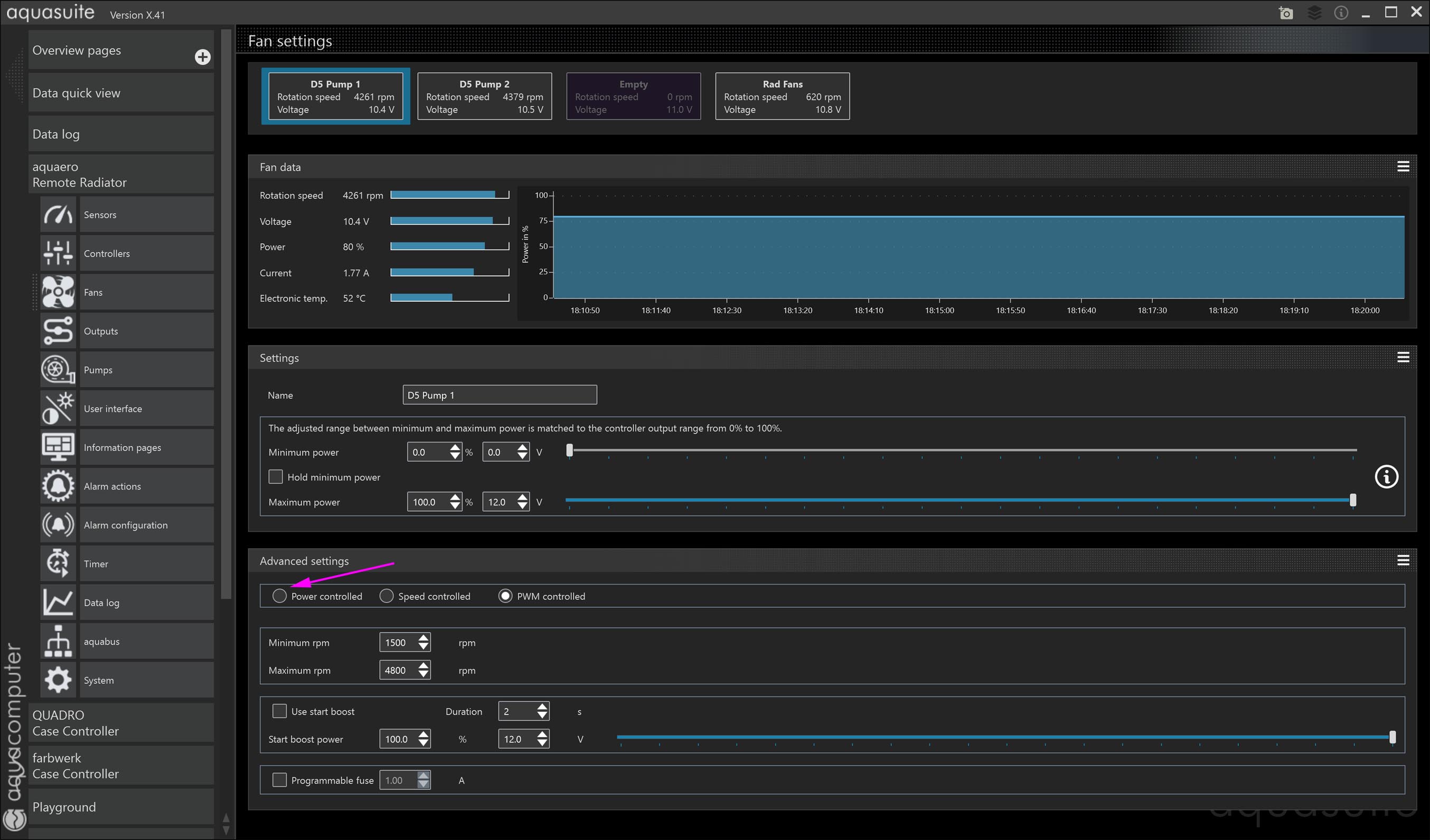 In the Fans config of Aquasuite, whatever i choose (power controlled or speed controlled), "fan data" always display voltage =12V and current = 0.20A