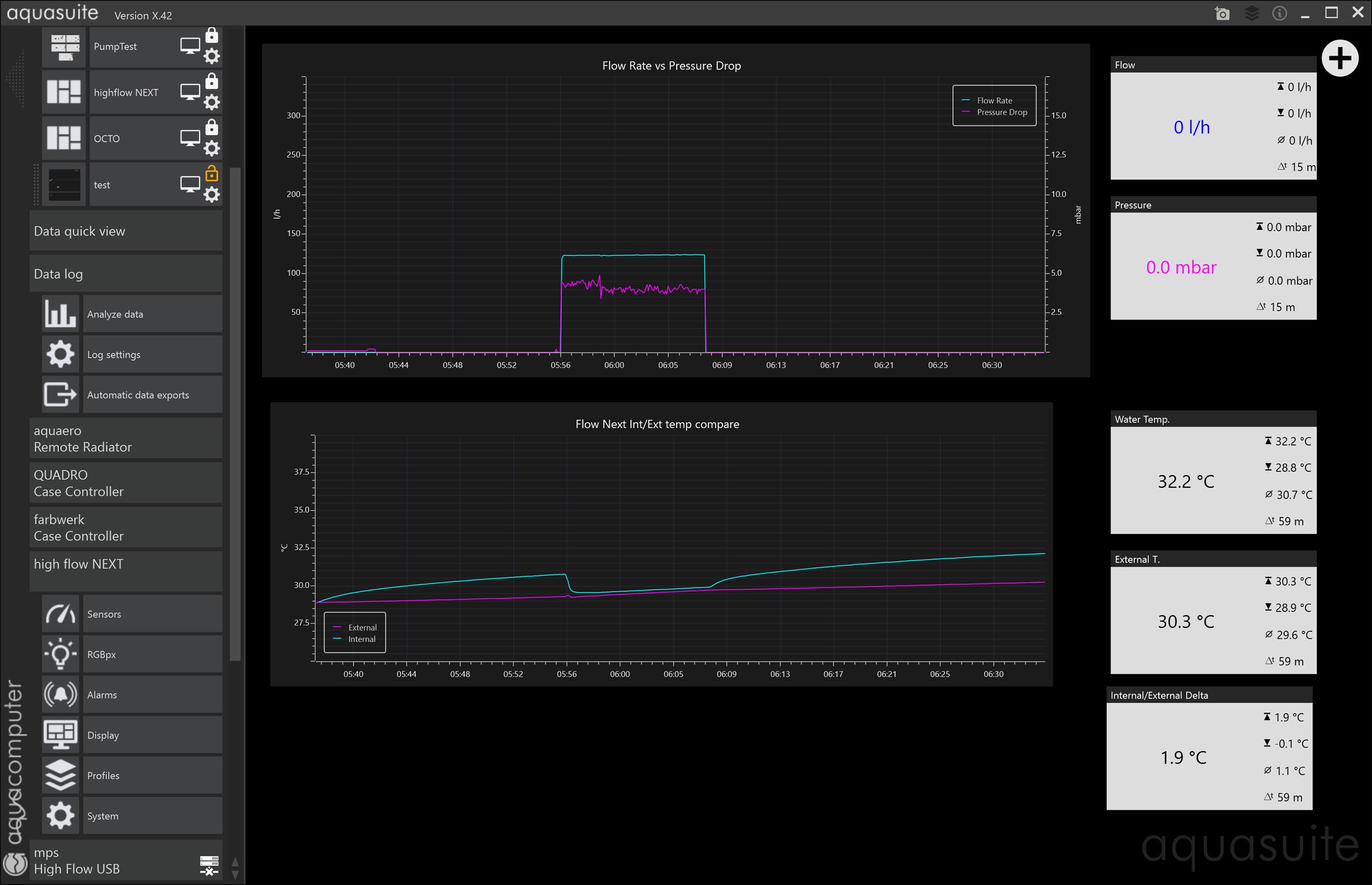 • when I de-activate the pump again, the Flow NEXT internal sensor rises, while the external sensor remains steady