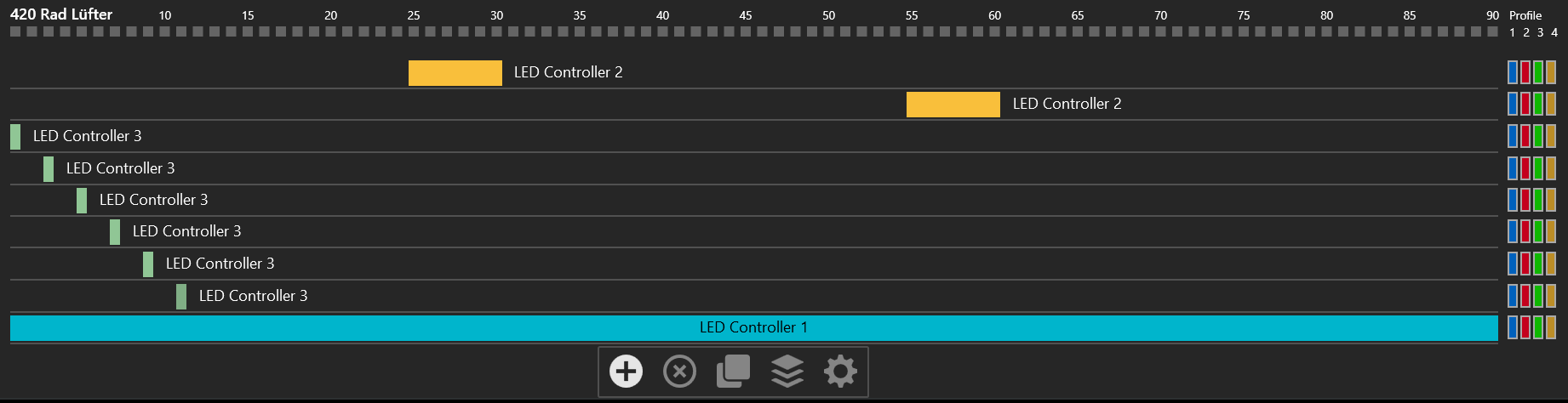 Bei 4 Lüftern die je 2 unabhängige Zonen haben (Rahmen und Rotor) bräuchte man insgesamt 8 Controller um alle Bereiche unabhängig zu steuern, man kann aber nur 6 LED Controller in der aquasuite pro Strip erstellen.