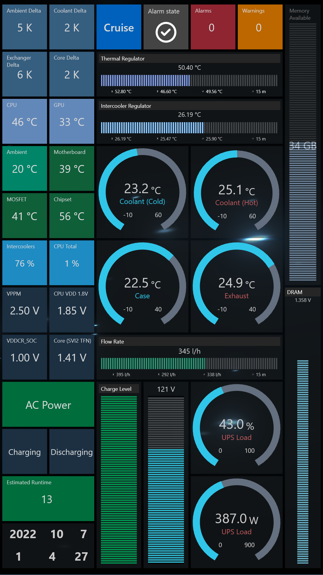 The primary bit of info I designed it around was the multi guage dials, reading my water temp vs ambient, with a delta for the ambient temp vs water temp (blue and green text centre top left), with outer graphic readouts for GPU core and temp, and CPU core and temp. It's also showing graphs of the same, giving me history of the readouts.