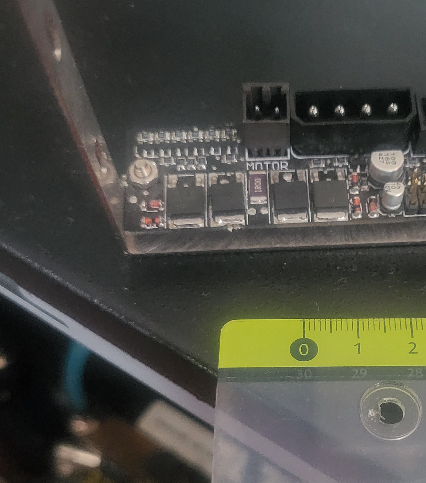 Zur Dokumentation für die Nachwelt:Die Abstandshalter sind silberne 4mm "Motherboard-Abstandshalter-Schrauben"; zusammen mit dem Halter ist die Frontplatte dann im idealen Abstand von der Platine, so dass die LEDs in die Löcher passen und bündig abschließen.
