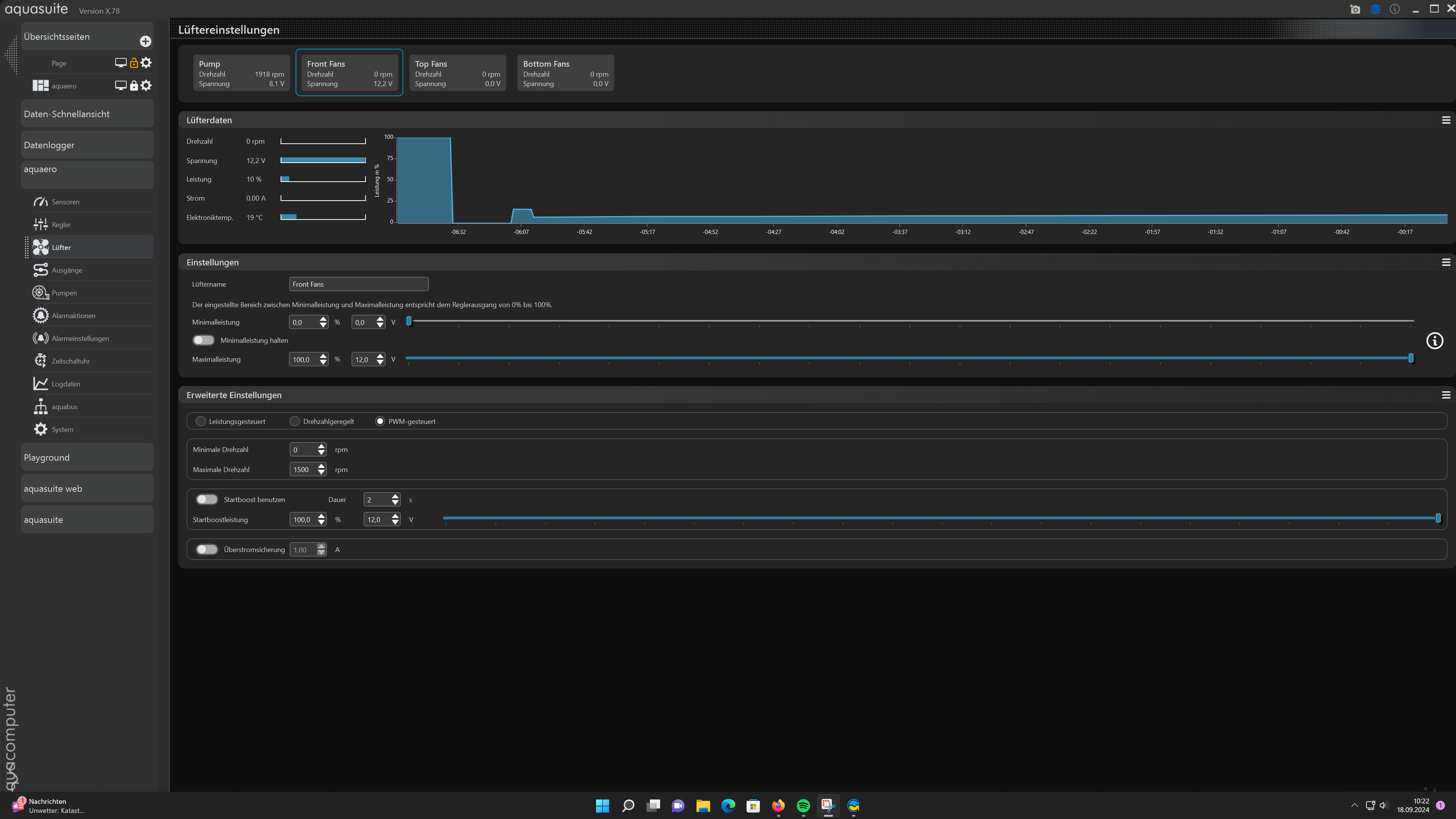 Ich habe dann mal alle Einstellungen exportiert, den Aquaero zurückgesetzt und die Einstellungen wieder importiert. Das hat gut funktioniert und es hat vom Frühjahr, den ganzen Sommer lang, bis vorgestern, gut funktioniert. Seit 2 Tagen erneut das Problem. Also wieder Reset und Einstellungen importiert, hat diesmal leider nichts gebracht; Kanal 2 läuft immer auf 100 % Leistung, auch nach Import der Einstellungen. Ich muss jetzt jedes Mal, wenn ich den PC starte, die Einstellungen etwas verändern, damit die Lüfter mit der richtigen RPM laufen.