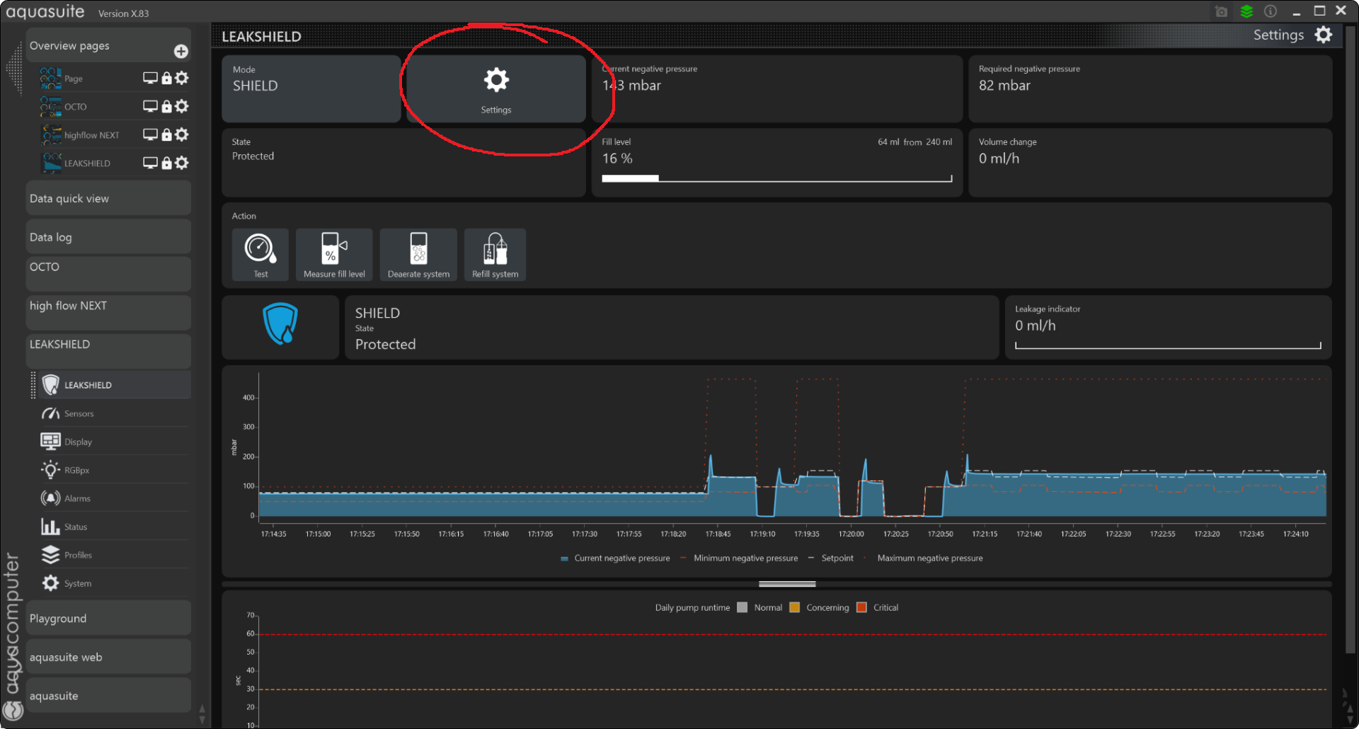Having the system at -400 mbar and below constantly isn't normally required, unless you have a high flow rate (200+ l/h). If you can pass the flow rate and the pump speed onto the Leakshield in its Settings, you could also use the adaptive pressure setting, and leave it to figure out the optimal values on its own. But that won't help the alarms, as those are triggered by the rate of change in pressure, not the absolute value of the pressure. This being said I also had the occasional alarm when the computer went to full load then back to idle. The coolant temperature and the system pressure can swing out a lot and sometimes that triggers an alarm. No need to worry about that. When there's an alarm at a steady state, only then you may want to investigate.