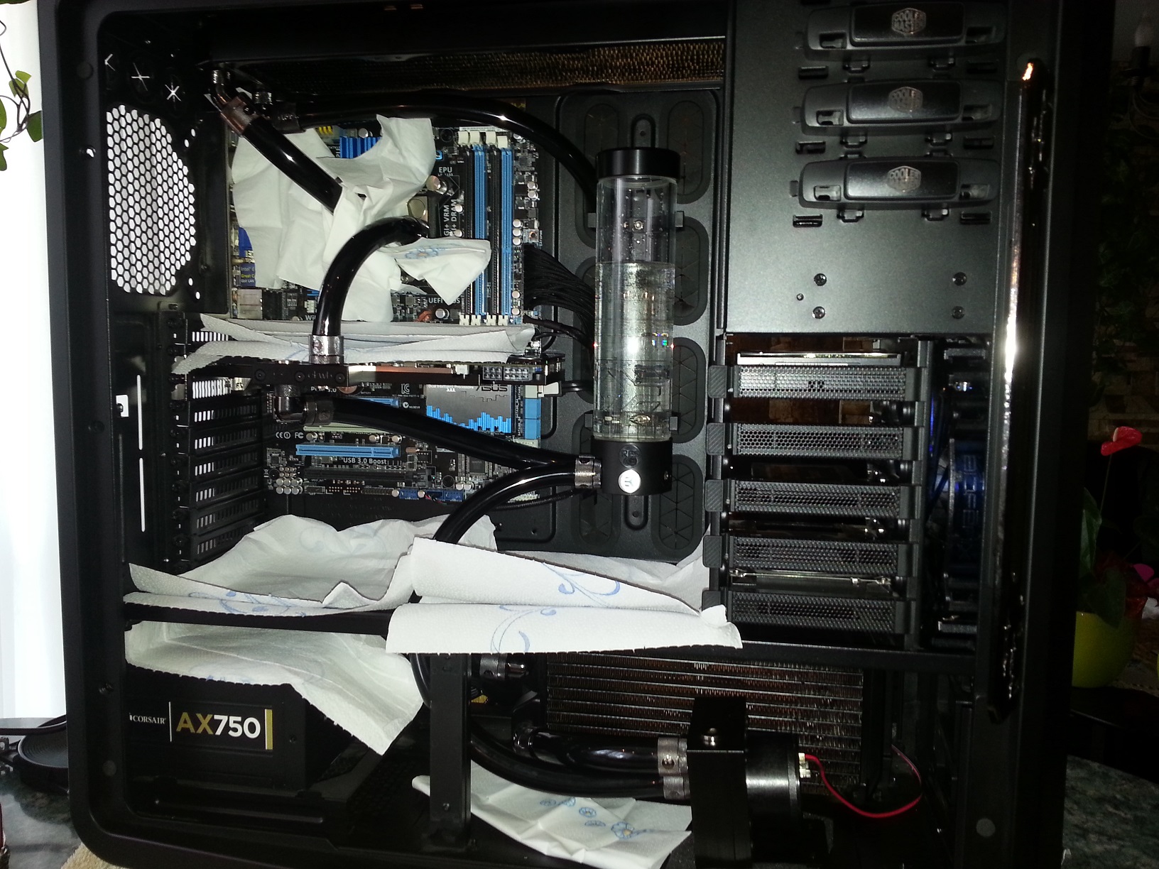The computer is completely disconnected. Only the pump and one of the fans are connected directly to power supply via molex. I used a paper clip in order to jump-start the power supply without motherboard.