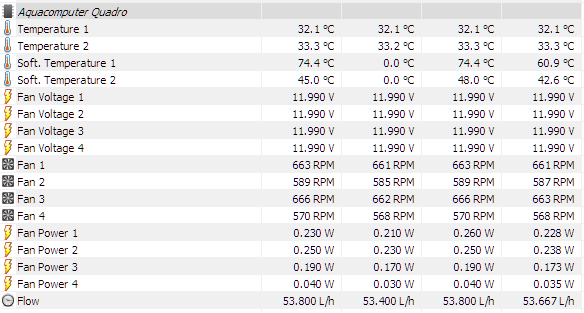 Vom Aquaero und der D5 Next kann ich alle Sensoren und Werte der Lüfter auslesen, auch Spannung, Strom, Temperaturen der Lüfterregler des Aquaero, Durchfluss...