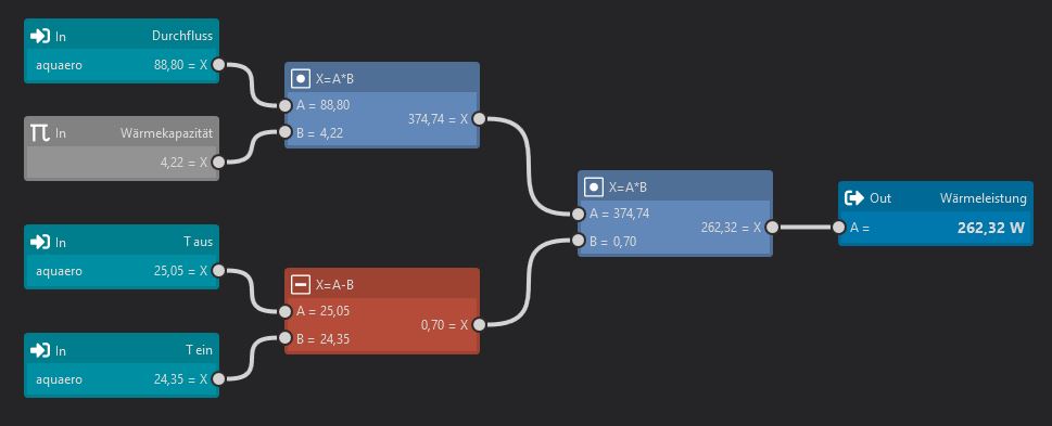Bei der Darstellung hatte ich die Idee nicht blos die Temperatur- und Durchflussanzeige darzustellen, sondern gleich die Wärmeleistung je Komponente.