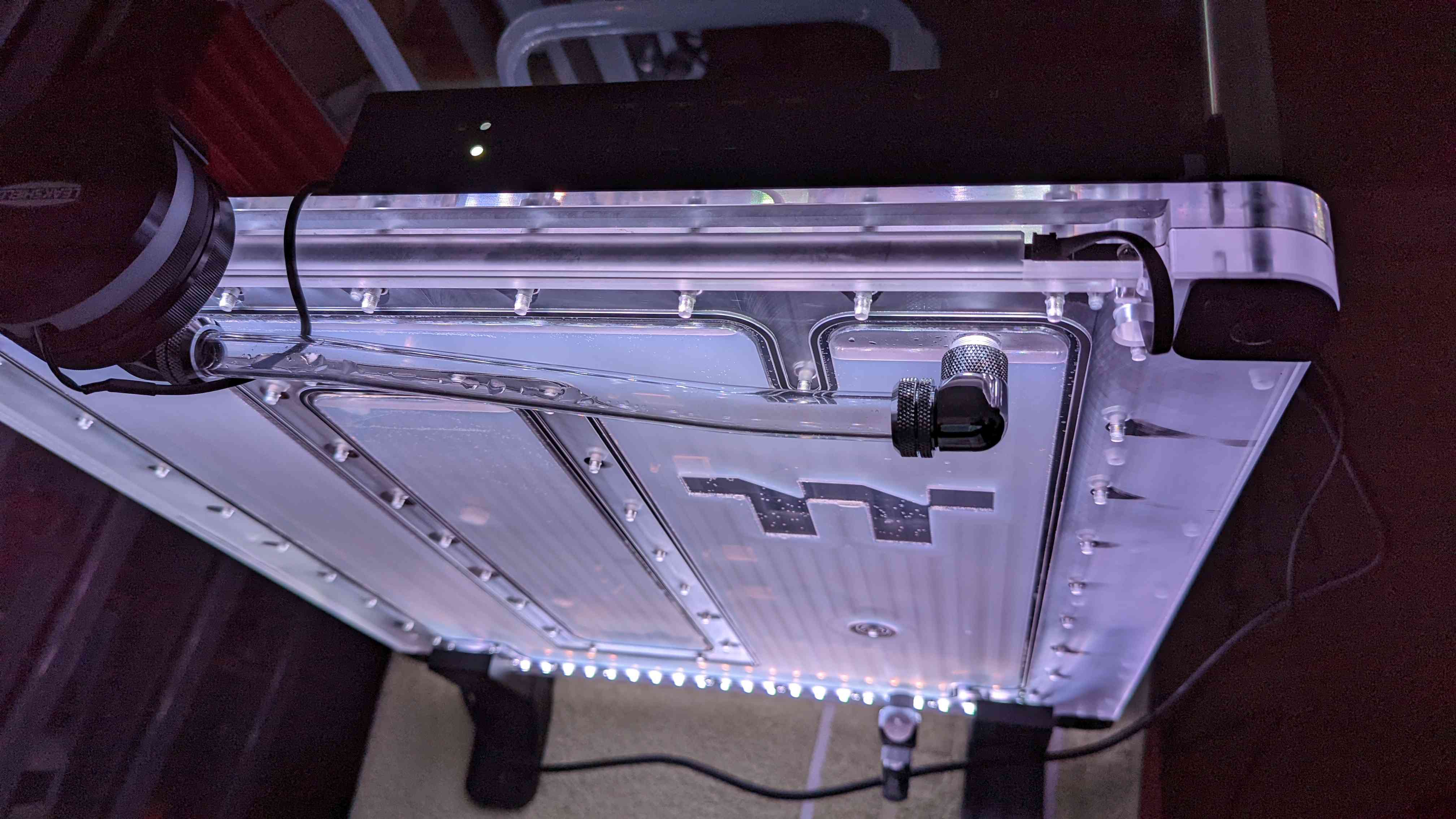 ▪ Diverse Anzeigeelemente und RGB-Leuchteffekte▪ Aquacomputer Komponenten: Leakshield, D5 Next, Highflow Next, 2x Vision RGBpx, CPU Kühler mit 925er Silber Acryl und Vision, 420er Radiator Kupfer, Farbwerk 360, Hubby7