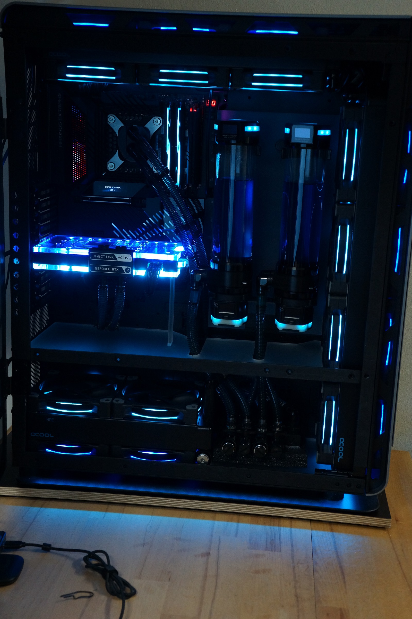 Der Innenraum ist bis auf die Stromversorgung für die Graka kabelfrei. Dem GraKa-Kühler hab ich den hinteren Acetal-Block geklaut, damit liegen die Schläuche für den CPU-Kühler schön in dem Ausschnitt. Bauzeit war jetzt ca. 1 Jahr wegen Verfügbarkeit, abnormalen Preisen und letztendlich auch Überspringen der Alderlake-Gen und zuerst geplanter RTX 30XX-GraKa.