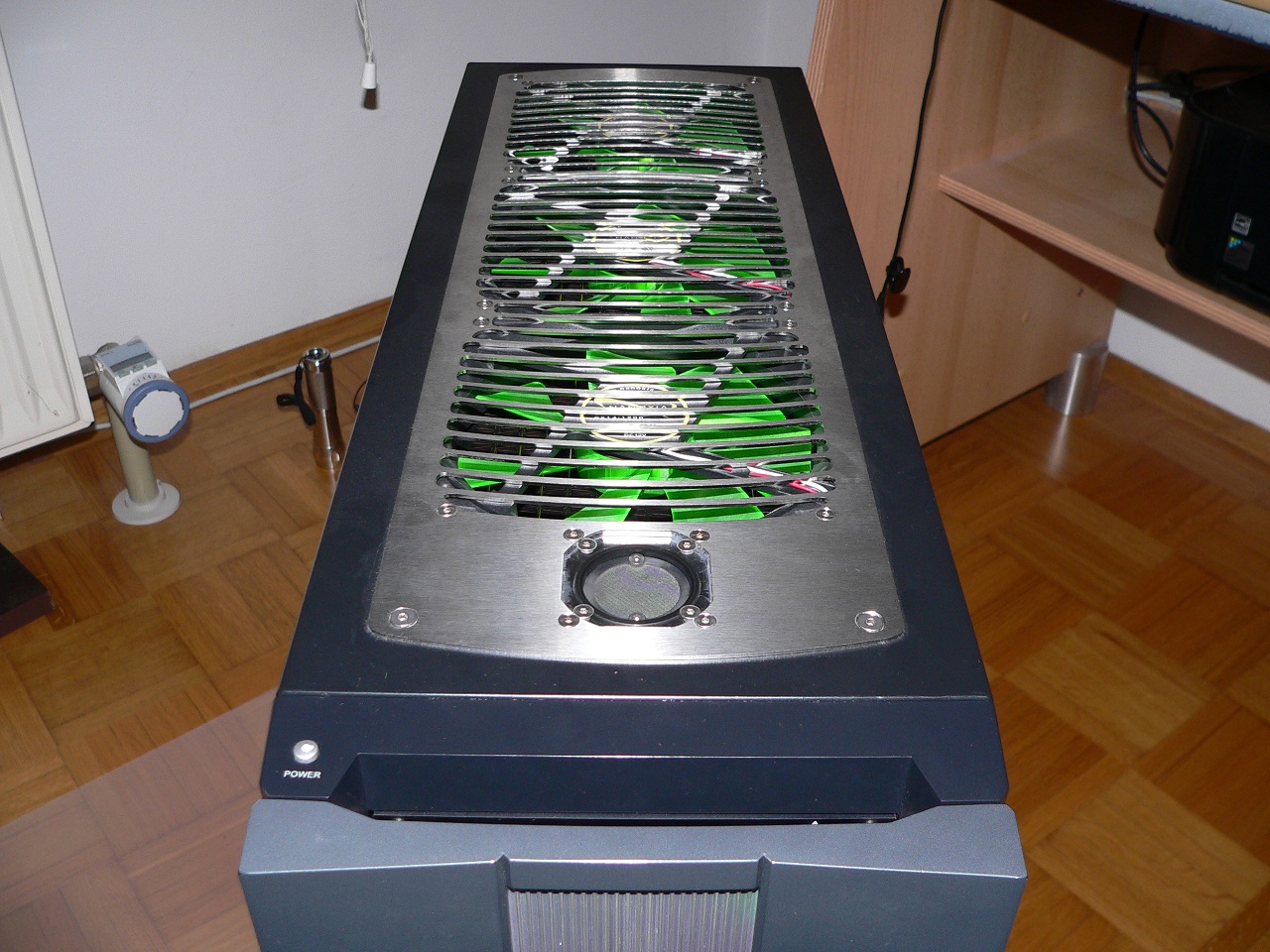 Das Gehäuse ist von 3R Systems Typ R900 (oder auch R910). In meinen Augen das perfekte Gehäuse für Wasserkühlung. Dank 2 Netzteilschächten übereinander ist genug Platz für einen Radi. Auch die Wasserpumpe lässt sich super einbauen.