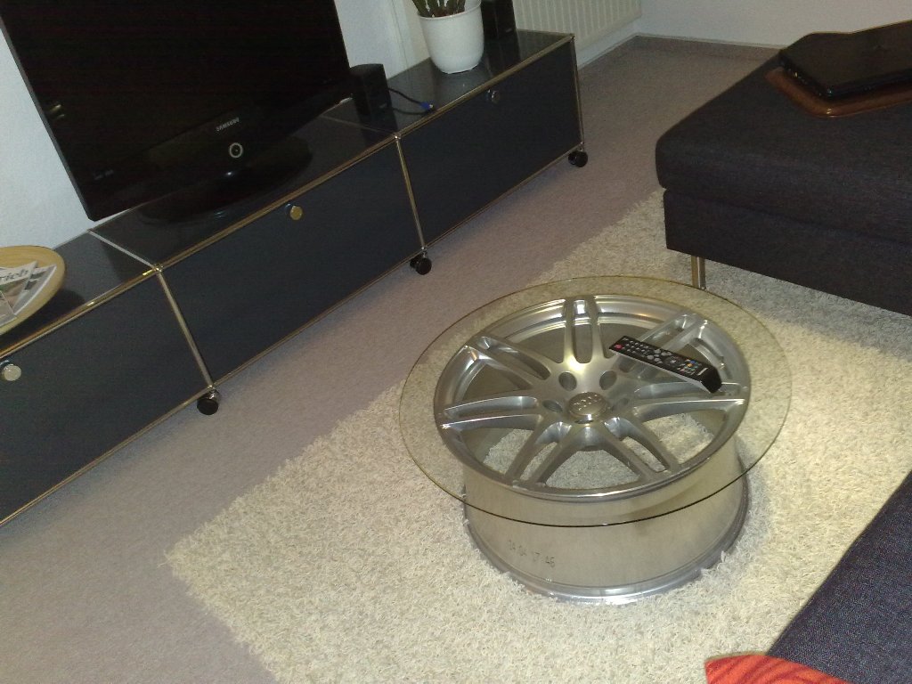 Ich hab ne 10x21" Felge aus Couchtisch. Als Tischplatte hab ich einfach eine 5mm Glasplatte von Ikea (20€) draufgelegt. Auf das Felgenhorn hab ich sieben kleine transparente Gummipuffer geklebt.
