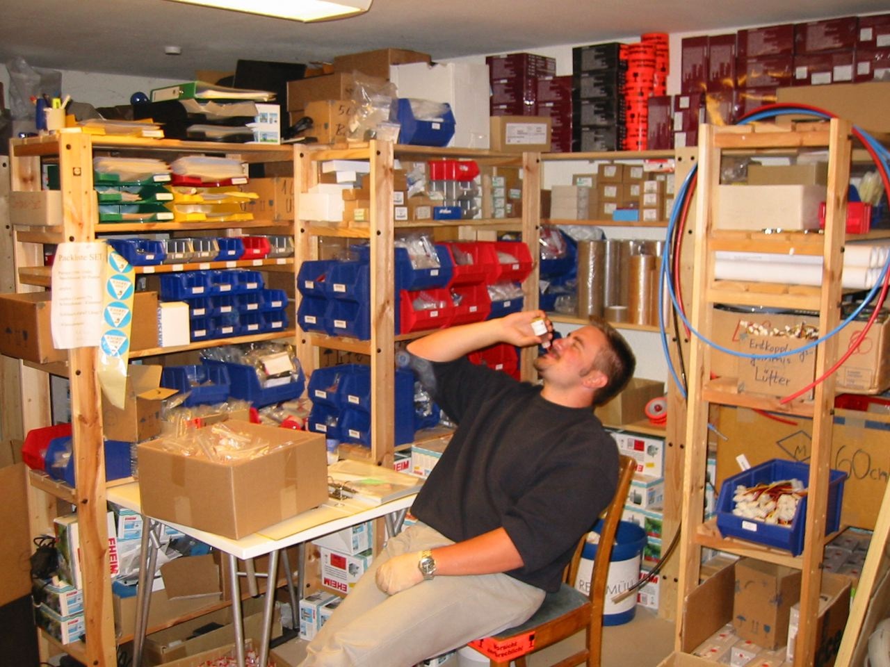 In der roten Wanne waren die offenen Aufträge. Kurz vor dem Umzug war das dortige Lager im warsten Sinne des Wortes komplett bis unter die Decke vollgestapelt.