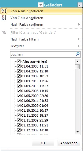Vielen Dank für deine Mühe, aber das half leider nicht. Bei mir gibts nur "von A-Z sortieren, ich habe alles exakt so gemacht wie du gepostet hast. Abgesehen davon dass ich erwartet habe dass Excel das Datumformat auf engl. ändern kann damit ich wirklich von A-Z sortieren kann, funktioniert das so nicht, also es passiert zwar etwas, aber es wird nur anders durcheinandergebracht, geordnet wird da nichts nach Datum.