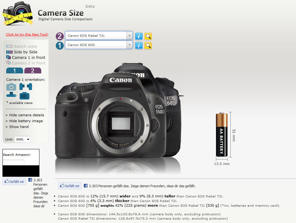 Da kann man über die Schaltflächen links die Kameras in alle möglichen Richtungen drehen und die Größe vergleichen. Sogar übereinander geht, um die Unterschiede direkt zu sehen. Vergleicht mal die 550D mit der 1D... :thumbsup: