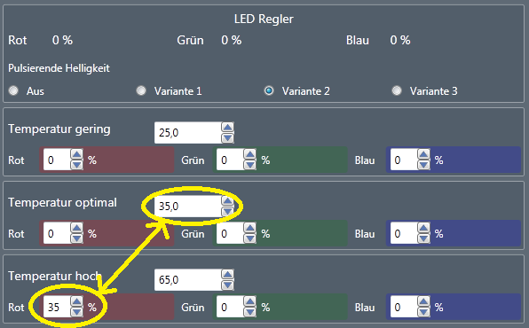 Beispiel: Habe ich bei "Temperatur optimal" 35°C eingestellt, lässt sich bei "Temperatur hoch" die rote LED nur auf minimal 35% stellen.
