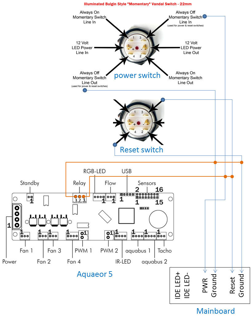 I have 2 switch on my case power and reset, but I'm not sure how I can connect the wires to the relay? so I can powering the PC up/down, standby and reset by aquaremote or emergency shutdown the PC?