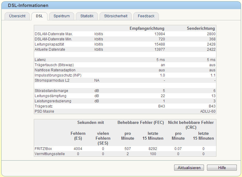 Japp, hängt wirklich von der Verfügbarkeit der Technik und der Anschlusslänge ab. Ich hab etwa 1,5km zur Vermittlungsstelle und so schaut das in meiner Fritzbox 7390 aus:
