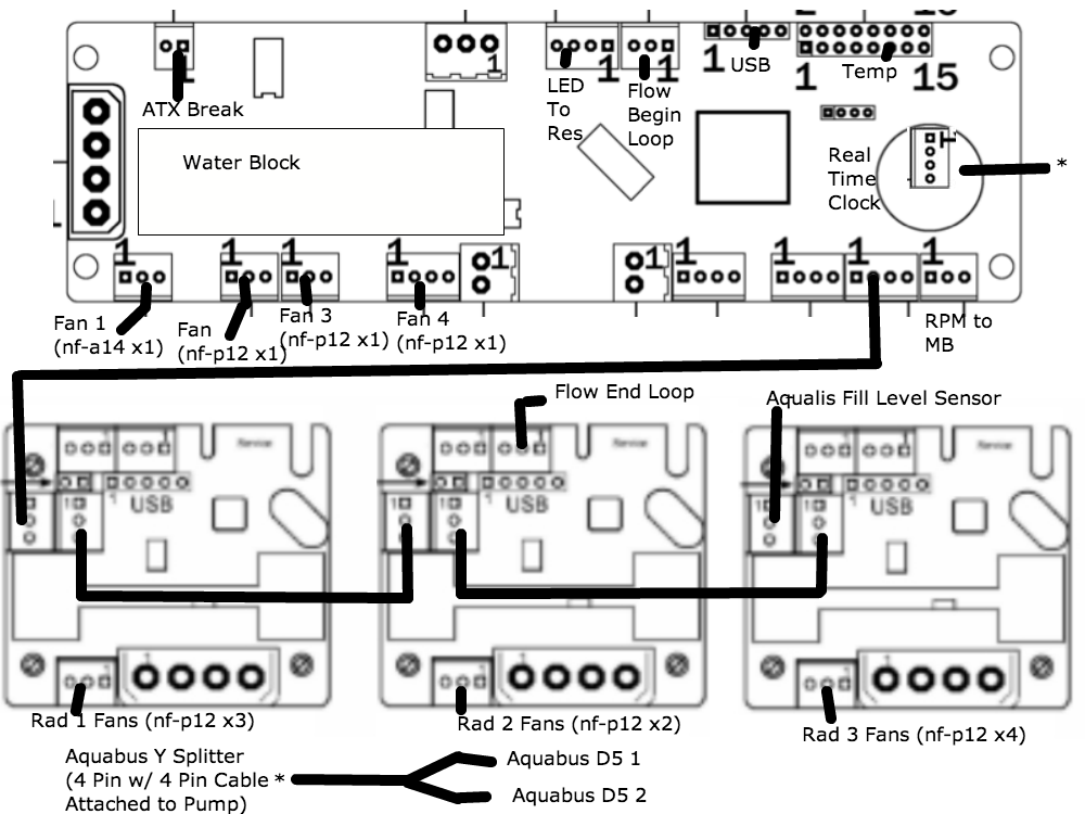 A little about the system, I guess before I hit the diagram. 2 Aquabus D5 pumps running in serial, 1 Aqualis XT w/ fill sensor, 3 Alphacool NexXxoS XT45 rads (240, 360, 480), about twelve feet or so (guessing) of 3/8 ID 5/8 ID tubing, 2 Swiftech Komodo 780 blocks, 1 Swiftech Apogee HD CPU block, Maximus VI Formula (Will be cooling VRM), two high flow meters USB version (which I just realized I needed), 3 Poweradjust 2 Ultras, Aquaero 5 XT, Real Time Clock Expansion Module, ATX break, LED inserted into the res. All this is going to be one big loop. That should about cover it, I think. I'm EST, but should be around till about 0100 GMT if I am needed to figure this out. :thumbsup: