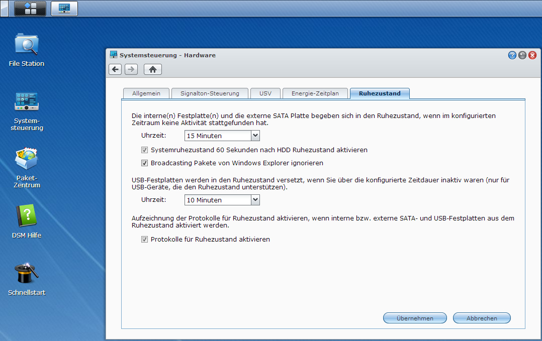 Hast du "Broadcastingpakete vom Windows Explorer ignorieren" aktiviert in den Ruhezustandsoptionen? Neuste Firmware drauf? Meine DS413 hat die 4.3 drauf wobei seitdem mein DeepSleep Modus nicht mehr funktioniert. X( Ich hoffe Synology behebt das Problem, betrifft aber nicht dich, du hast einen fast genau so sparsamen HDD Ruhezustandsmodus. Ich würde am Anfang solange du konfigurierst und alles einstellst den Ruhezustand deaktivieren. Wenn alle Daten wie Fotos, Musik, Videos, drauf sind und du die entsprechenden Pakete installiert hast, den Ruheszustand wieder aktivieren. Die WD red sind meines Wissens nicht nur für Dauerbetrieb sondern auch für schnelles und häufiges Hochfahren gebaut, von daher sollte das keine verstärkten Auswirkungenbzgl. Verschleiß haben.
