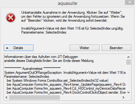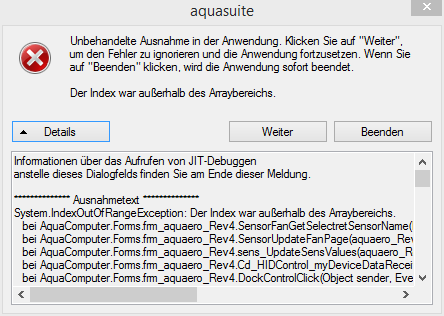 Leider kann ich den kompletten Text unter Details nicht kopieren, da gleichzeitig im Sekundentakt diese Meldung immer wieder neu erscheint und den Fokus erzwingt. Nach einem Klick auf OK wird die aquasuite mit den Fehlermeldungen dann geschlossen.