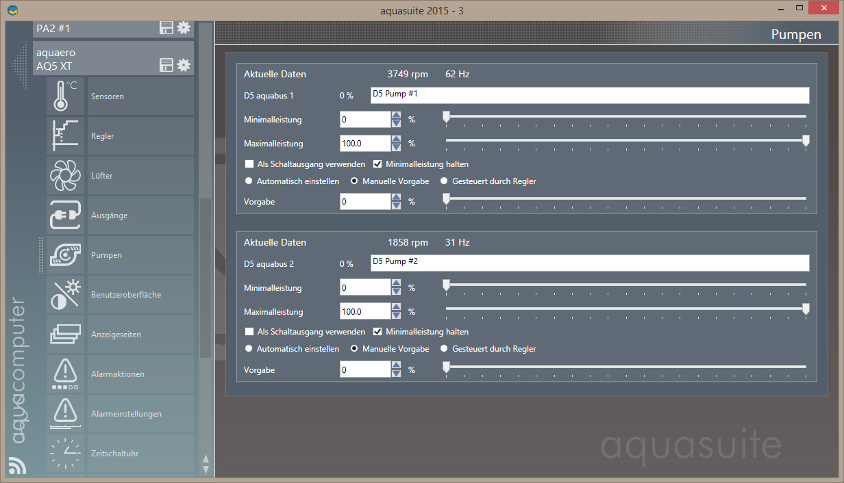 Die Pumpen werden so eingestellt wie man auch alle anderen Lüfter usw. einstellt (Regler). Bei den Pumpen muss man dann noch angeben das diese per Regler gesteuert werden.. Wo kann ich den Soll-Wert der Pumpe angeben? Ich hab nur den Regler gefunden, wo ich die Pumpenleistung in Prozent einstellen kann, da stehen beide auf 100%. Ist das in den Einstellungen zum mps-Gerät oder unter "Pumpen" in den Aquaero Einstellungen?