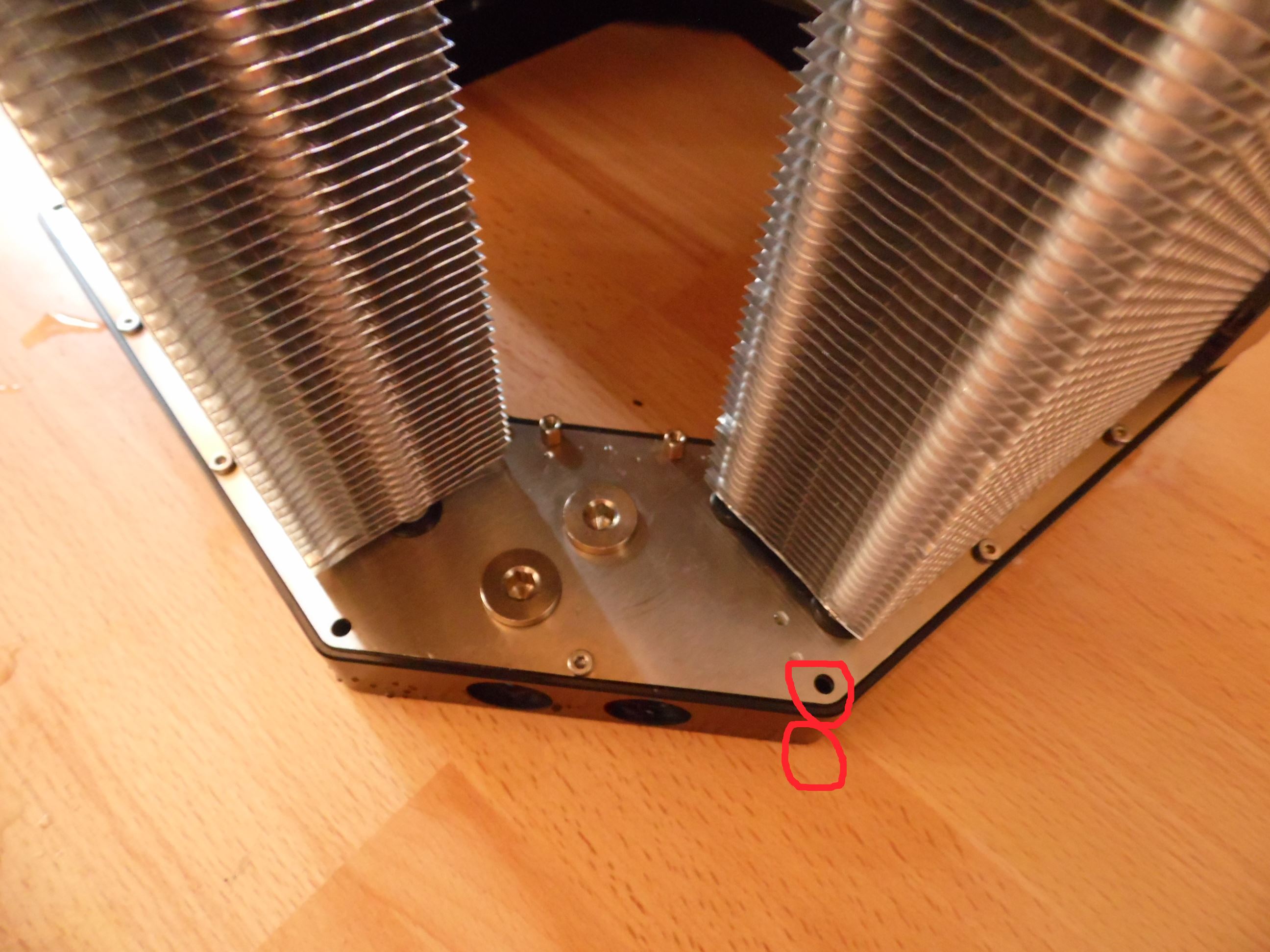 Riesensauerei auf dem Parkettboden mit dem Glykol/Wassergemisch, verlust des Kuehlmittels und ein nicht mehr einsatzfaehiger PC :/ Zudem hat sich dann noch eine der Inbusschrauben verabschiedet und steckt nun rundgedreht und versenkt in der Bodenplatte ... ich koennt grad ein bisschen schreien...