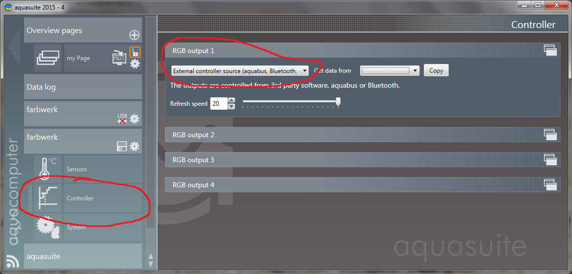 My 5LT sees the farbwerk on Bus address 20. The device also appears in the device list. I can also adjust the color settings withint the device itself using USB, but how can I control the device with the aquabus with no usb connected?