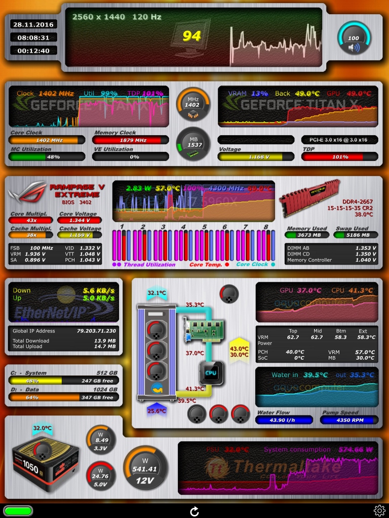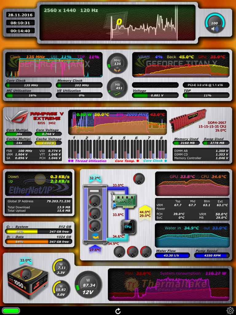 Derzeit setze ich noch die aquasuit 2016-4 ein. Das Monitoring übernimmt allerdings derzeit AIDA64, für das ich mit viel Arbeit ein sehr spezielles Profil erstellt habe. Das wird auf einem externen Tablett angezeigt, siehe Screenshots: