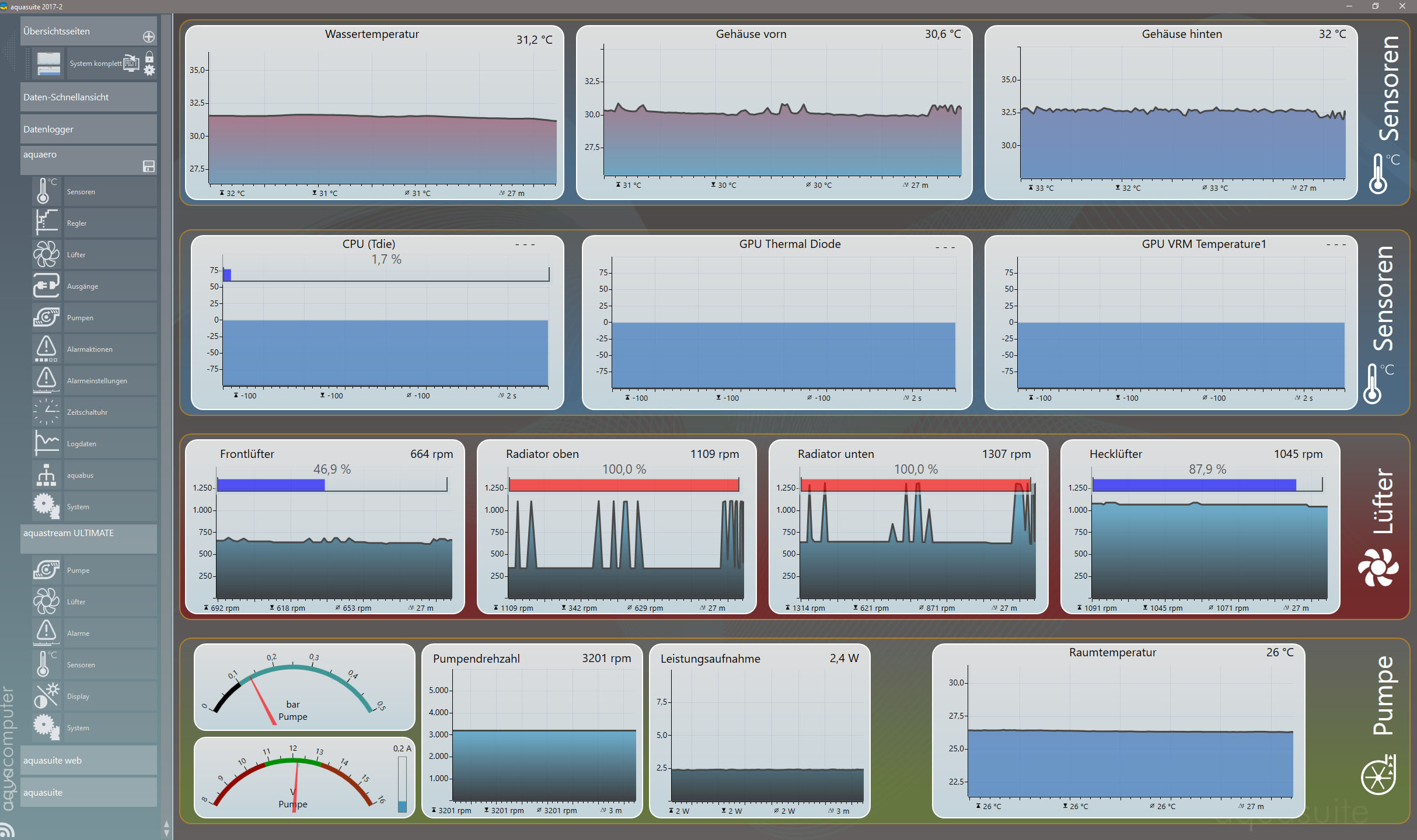 In meinem PC habe ich eine "aquastream ultimate" mit einem "aquqero XT6" eingebaut.In diesem Sinne habe ich natürlich auch die neuste Aquasuiteversion installiert (2017-2). Beide Geräte sind über USB mit dem Mainboard verbunden. Mit dem internen Temperatursensor der Pumpe möchte ich über einen Kurvenregler 3Lüfter ansteuern. Damit ich die Temperatur an das Aquero übertragen