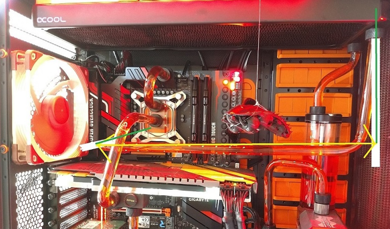 Bei euch beiden sind die Tubes schön symmetrisch, so hatte ich das eig. auch geplant. Gerade die Biegung vom Prozessor in den Motherboard-Kühler ist jedoch sehr eng und … schief, nicht schön symmetrisch vertikal.