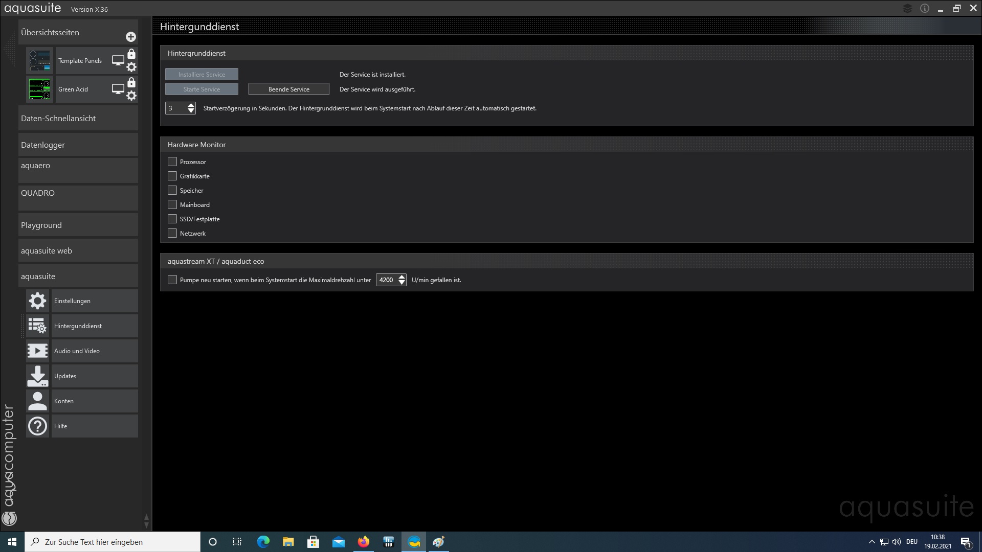 nach dem Neustart der Aquasuite wieder ins gleiche Untermenü und da dann den Service einmal beenden und danach wieder starten.