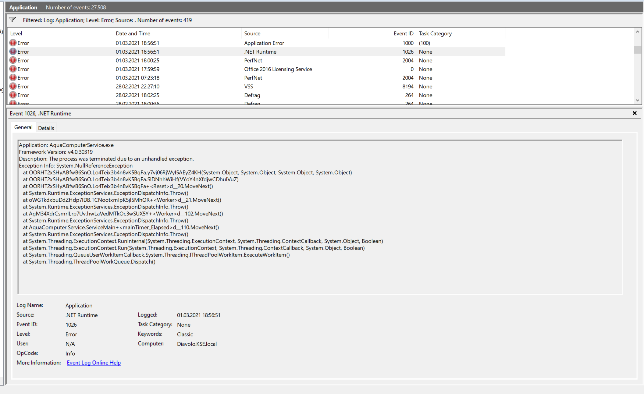 Unter "Quelle" (bei dem Screenshot "Source", mein Windows ist englisch) steht dann in der Regel ".NET Runtime", aber in der Meldung selbst kommt am Anfang "Application: AquaComputerService.exe" vor.