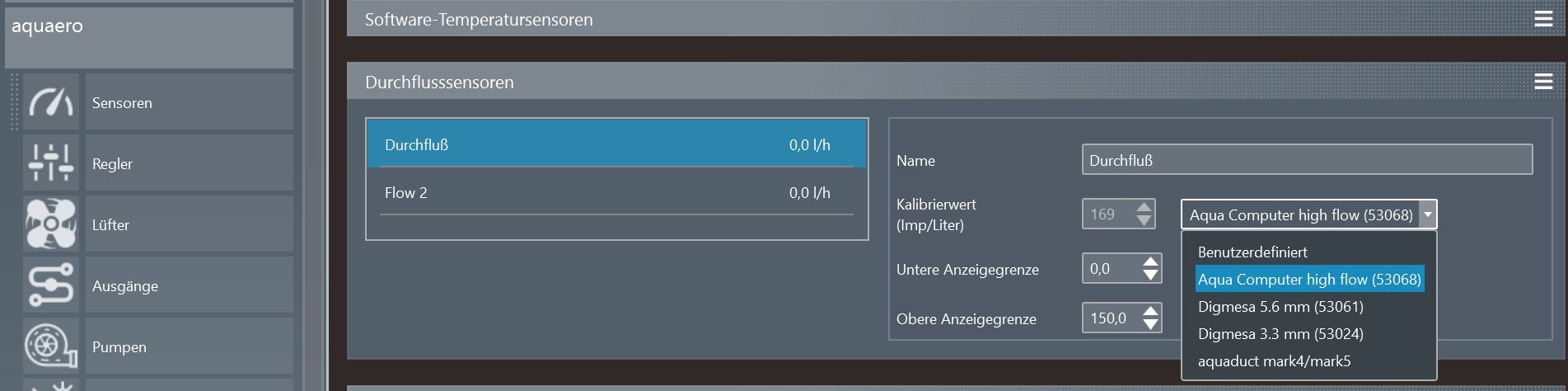 Da der HighFlow Next nicht direkt am Aqauero angeschlossen ist, kann man ihn auch nur als Software-Sensor im Aquaero einbinden und nicht direkt. Und als SW-Sensoren gehen nur Temperatur-Fühler, nicht aber die Durchflussmenge.