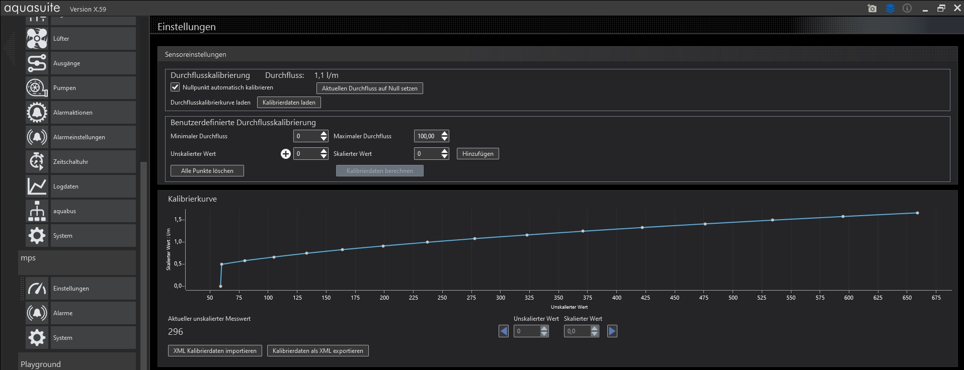 Frisch auf Werkseinstellung ist das hier die Kurve. Gerätetyp steht selbsterklärend auf MPS Flow 100. Beim Flow 400 sieht die Sache nahezu identisch aus. Wenn ich die entsprechenden Kurven lade, passt das Programm etwas an, jedoch bleibt der Bereich bei 0 - 3 L/h.