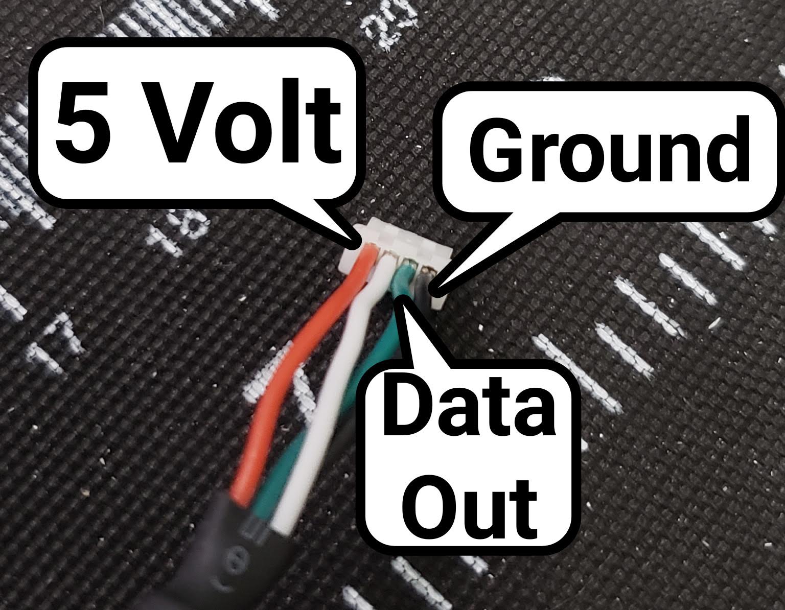 If you look at picture attached, I've connected +5V to green (that one melted), GND to red and data to black. Yellow was unused. Please let me know if I did it correctly.