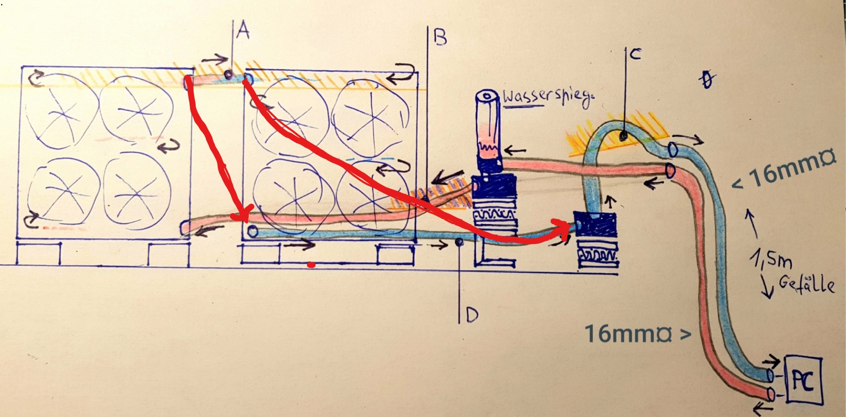 Ich habe es so gemacht, damit der zweite Radiator als AGB für die zweite Pumpe dient. Für den Fall es käme nochmal Luft ins System, Undichtichkeit, Druckabfall und das oberste Kanalrohr des Radiators wäre leer, dann würde da oben am Ausgang ja die Pumpe hängen und trocken laufen. So habe ich ein besseres Gefühl wenn was nicht stimmt, das die Pumpe Wasser bekommt, selbst wenn der Radiator nur 3/4 gefült wäre. Wäre im Falle einer Dualpumpe, wie sie m4jestic empfohlen hatte natürlich kein Thema mehr.Eigentlch sollte der Kühlerausgang vom linken Kühler (oben) in den Rechten kühler unten rein und wiederum oben raus. So bekommst du die Luft raus.