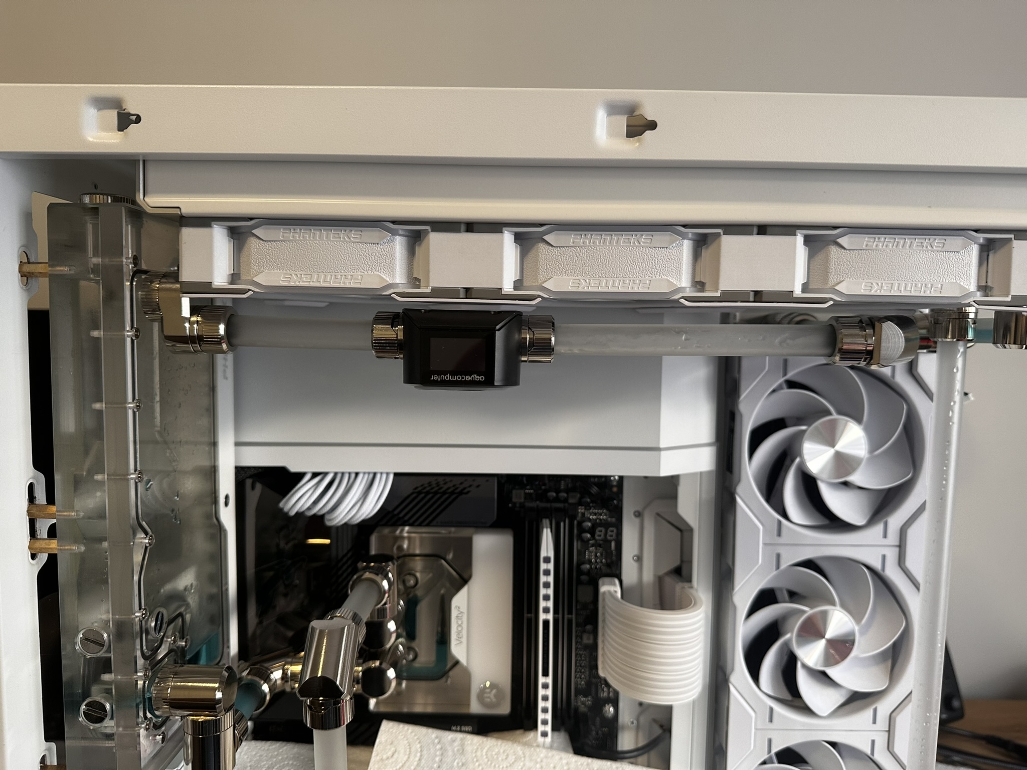 Why did you mount it upside down in the horizontal position? The manual says the High Flow Next does not care which direction the flow is. You could flip it 180° and have the coolant pass through it in the opposite direction. I guess you could not get to the buttons due to how close it is to the upper rad, but if it is connected via USB, you really don't need to use the buttons anyway. Can you mount it in the run from the GPU to the lower rad? That is a nice straight run and I think it would look good there assuming it does not cause the tubing to sag. If you mounted it in that run close to the GPU fitting maybe it could sit on the GPU back plate to support it (if its not too hot there).