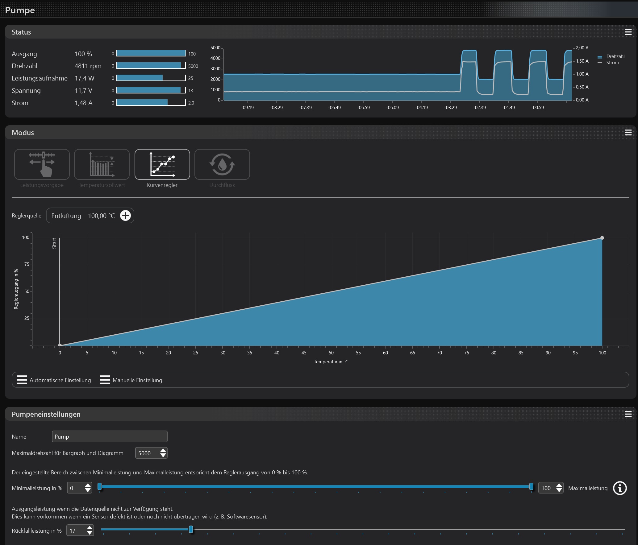 Dann musst Du bei der D5 Next ein neues Profil erstellen. Dafür einfach in Deinem Standard-Profil die Werte verändern die Du möchtest (z.B. LED Beleuchtung) und unter Pumpe "Kurvenregler" einstellen : 0°C = 0% und 100°C = 100%