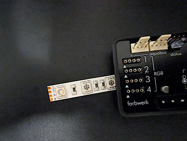 Upon opening the package I noticed that I am missing something rather crucial. A way of connecting the RGB light strip to the Faarbwerk. There are conductors on the strip, but no connector, so I can't plug them in.
