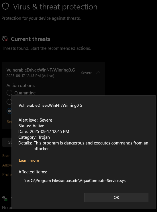 As of Sept 17, 2025 Windows Defender is now upset about Aquacomputer's use of WinRing0 on my machine as well. I understand a fix is coming, when might that be?