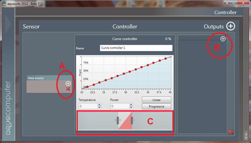 C: Temperaturbereichsauswahl, hier wählt man den Temperaturbereich des Reglers duch verschieben der beiden Marker. Auf der X Achse im Diagramm Sieht man dann den Aktuell gewählen Temperaturbereich. Man kann hier den Temperaturbereich vergrößern, verkleinern oder verschieben oder in der Kurve zoomen in dem man den Bereich verkleinert.