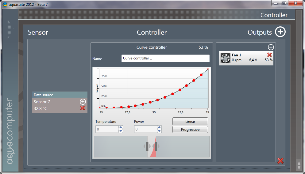 Man muss also zu einem Regler die Datenquelle wählen (Temperatursensor), dann geht man zu den Ausgängen in den gewünschten Lüfter und wählt als Datenquelle den gerade konfigurierten Regler als Datenquelle für den Lüfter.