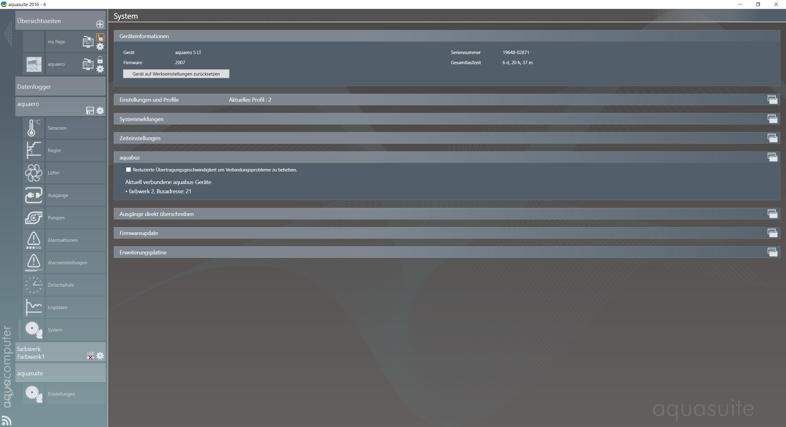 3. Erst wurde das Farbwerk vom Aquaero 5 LT nicht erkannt jedoch nach einem Neustart des Aquaero 5 LT wurde das Farbwerk korrekt unter Angeschlossene Aquabusgeräte auf Kanal 21 angezeigt