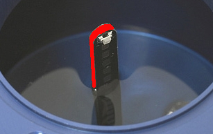 Jetzt wieder per USB angeschlossen und Kopfüber in ein Glas mit destillierten Wasser bis zum Gewinde gestellt.