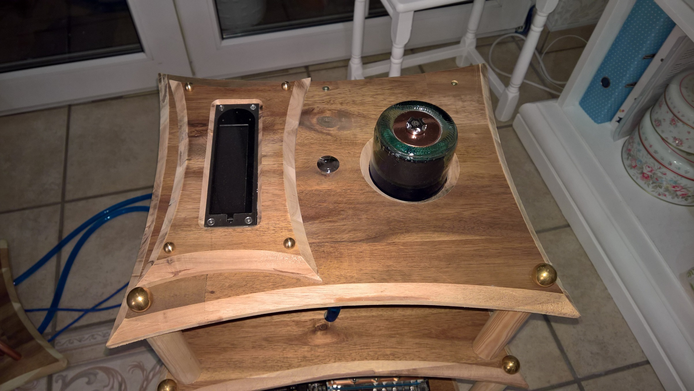 - Der hinterste Anschluss dient der Beleuchtung - auch hier ging es darum eine Position zu finden, bei der eine LED den besten Effekt erzielt, was nur unter dem angeschnittenen Glasboden möglich war.