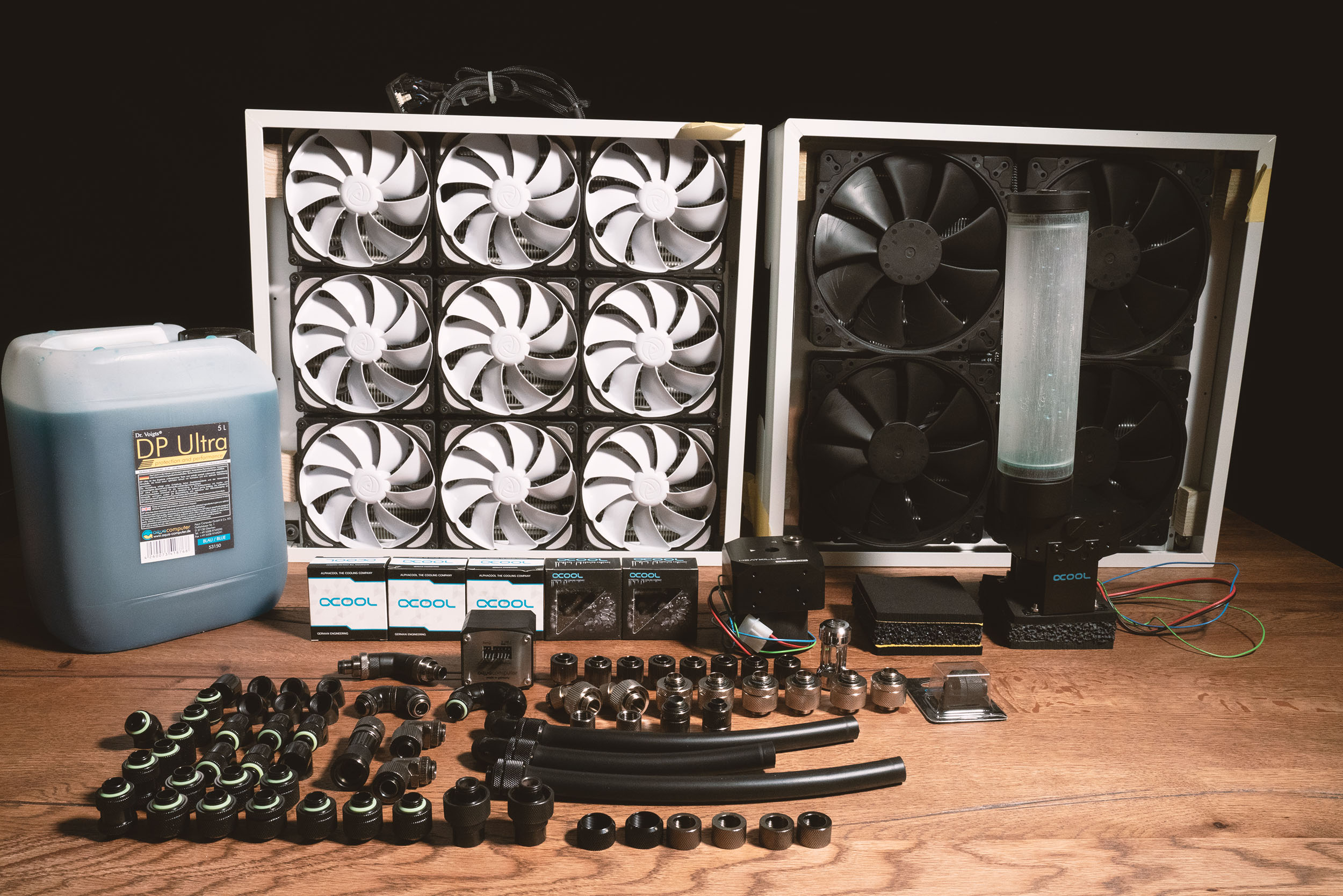 0,6m² Radiatorfläche. Das sind zwei 420er MoRa3 mit einem 4x 200er Noctua NF-A20 und einem 9x 140er NB-Eloop. Horizontal gelegt ist er einfach zu befüllen, aber offiziell wird er Vertikal aufrecht gestellt. Die Kanäle sind horizontal und die Ausgänge auf einer Seite oben und unten einmal.Was sind das für Radis? Rein von der Skizze mit Einlass oben/unten müsste das ja ein X-Flow sein, sofern die Wasserkanäle senkrecht liegen.