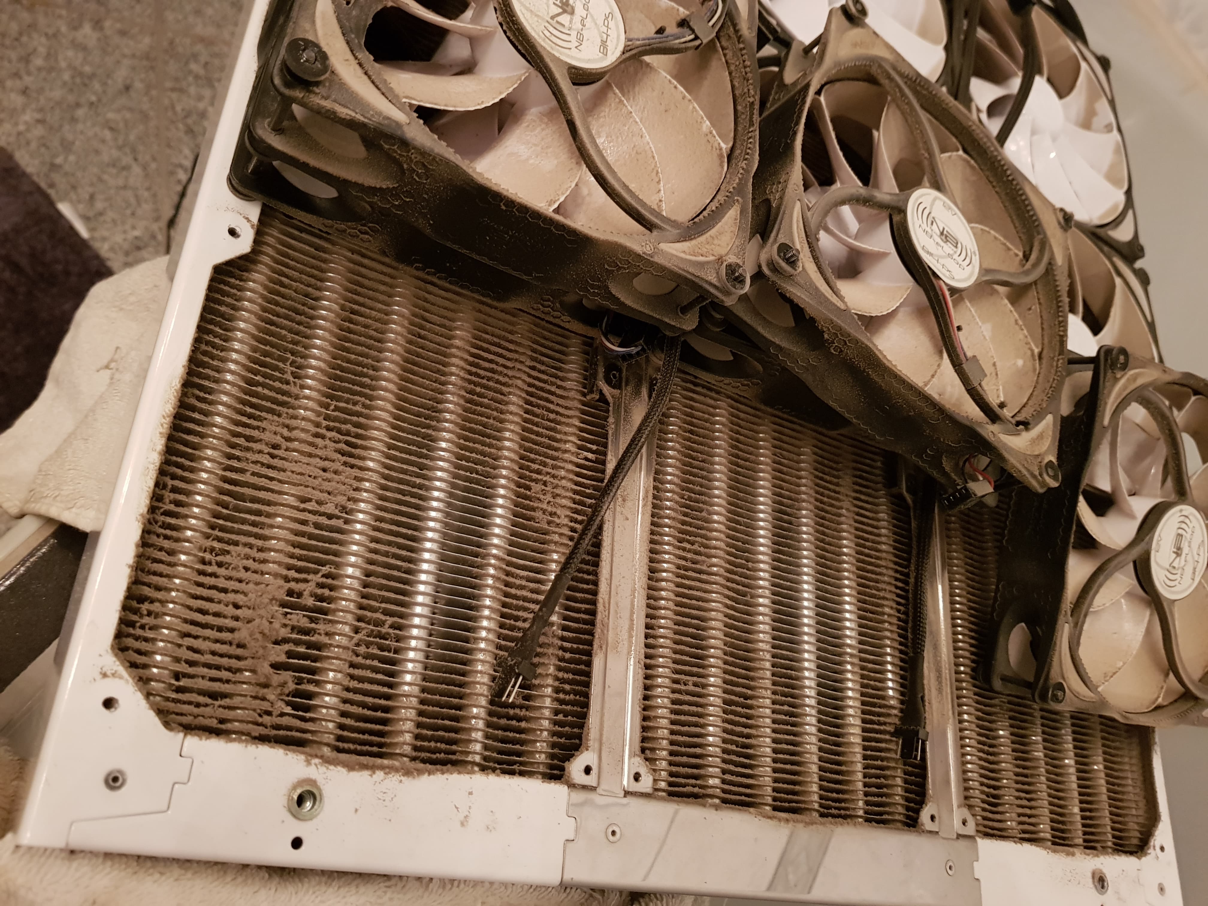 Einfach mal alle 3 bis 4 Monate auf die Leiter hoch und mit Druckluft durch blasen. Wenn du keinen Kompressor hast, gibt es ja Druckluft Sprühdosen. Musst halt in Etappen reinigen weil die schnell im Druck nachlassen.Im Bild siehst du wie ekelhaft staubig das Ding war, das will ich nicht nochmal.